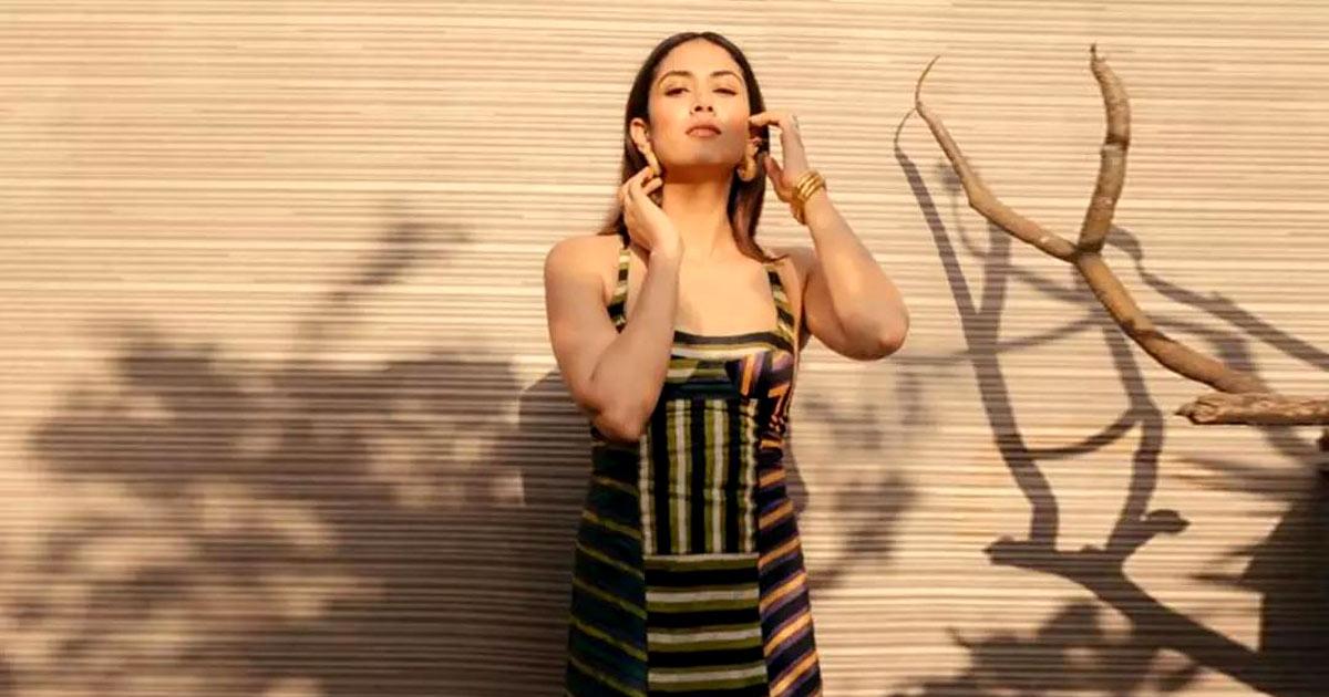 She proves she's the queen of minimalism in this striped Saaksha Kinni dress that she accessorises with beige strappy heels, chunky golden textured hoops and bangles.
