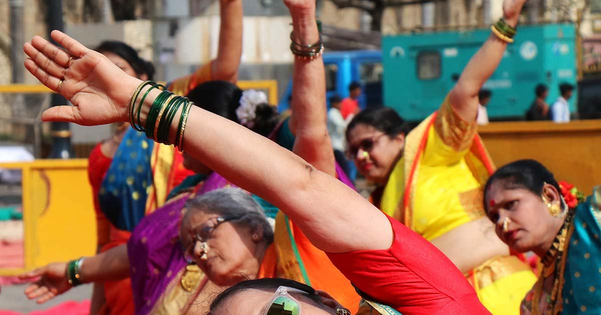 IMAGE: Their nauvari saris tucked in place, these cool ladies march to their yoga beat.