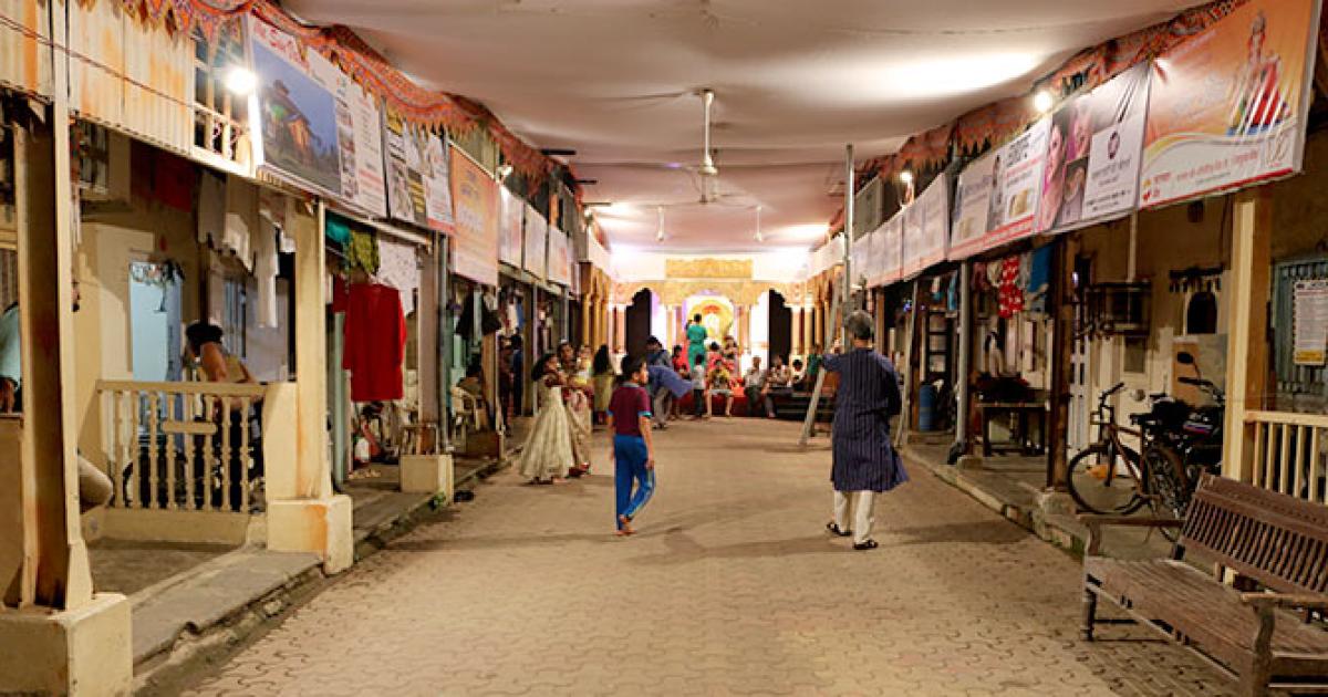 In front of the idol, on a small stage specially erected for the festive season, you will spot children playing games in the evening. Back in the kholis, their mothers quickly finish preparing dinner before the evening aarti begins.