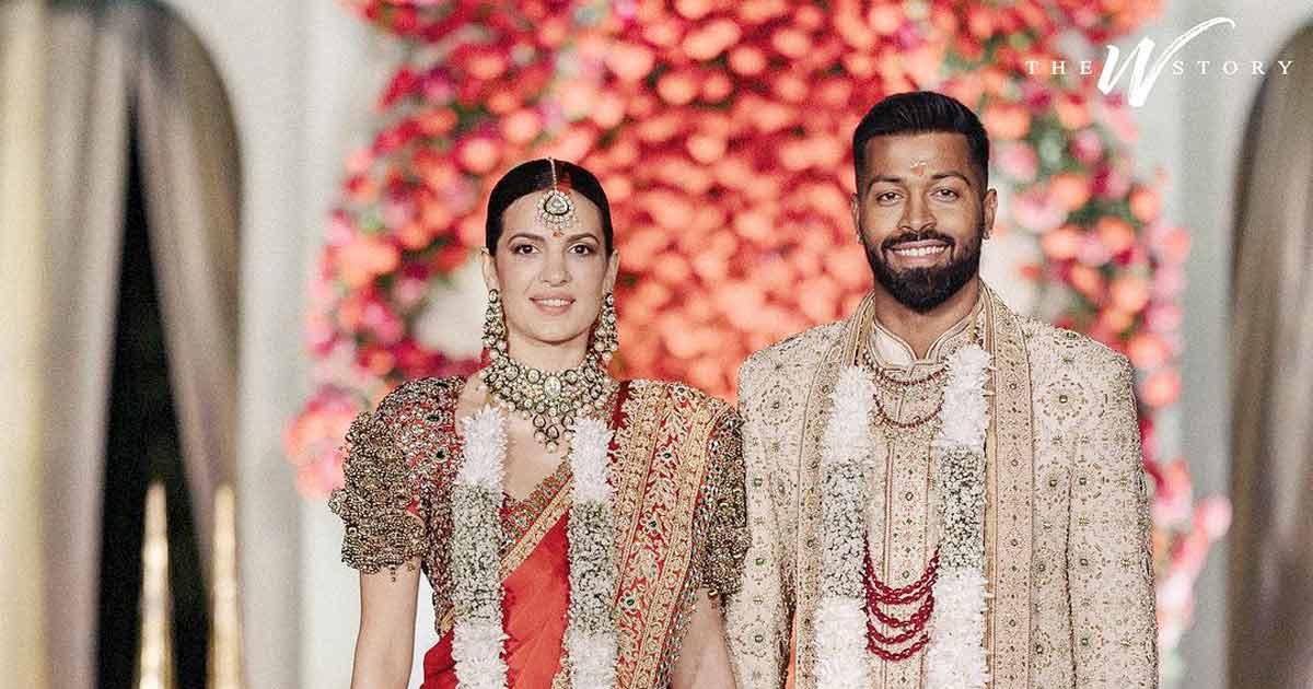 'Natasa was a vision in red in a satin sari, embroidered with gold, pearl, red and green beads,' the designers said as they shared the wedding pics on Instagram.