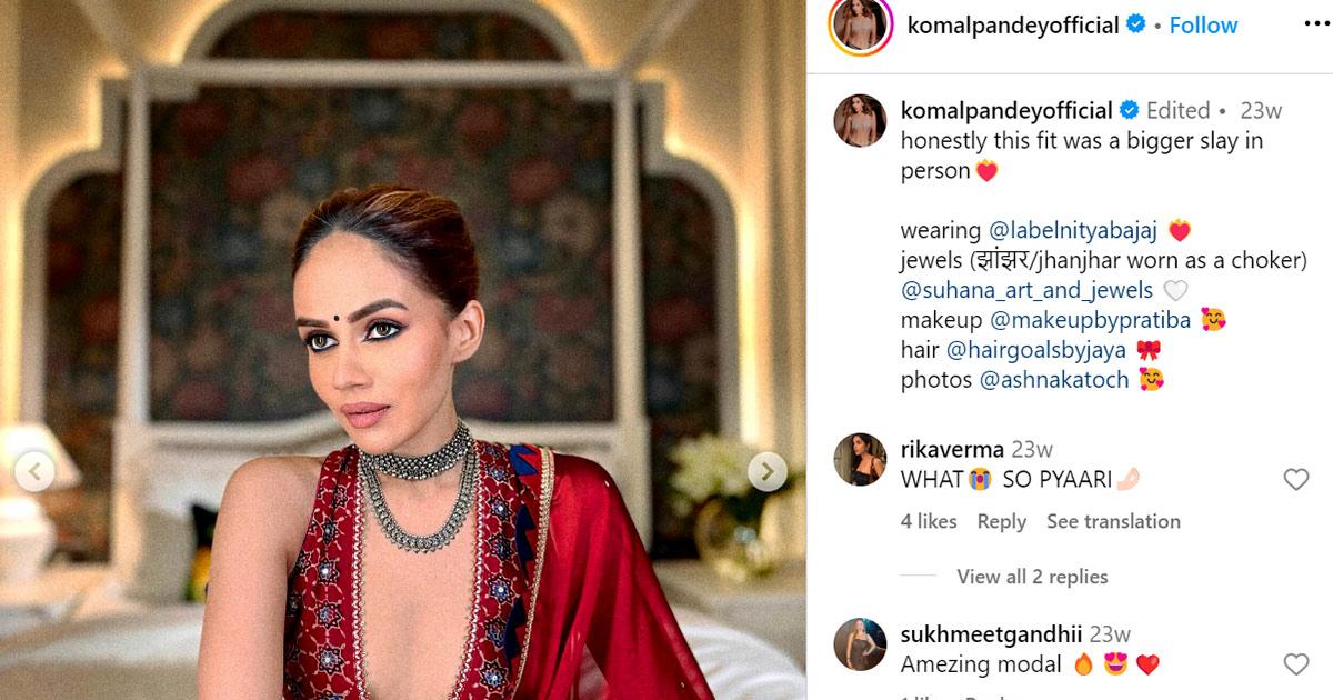 Komal Pandey stuns in a mesmerising red sari and a blouse that is oh-so-festive but certainly not for the faint-hearted.
