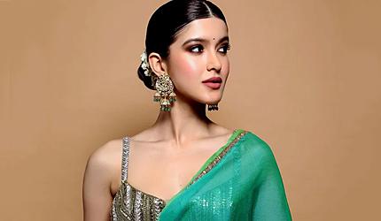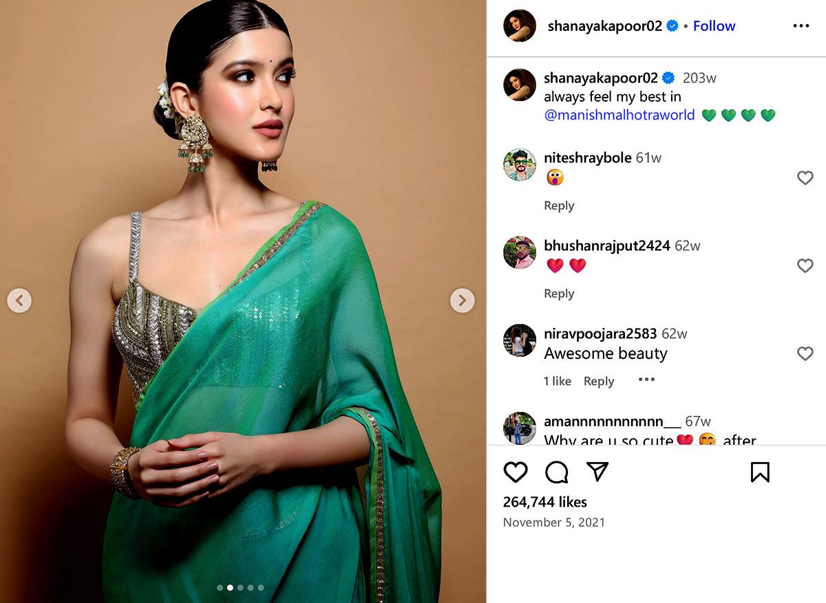 IMAGE: Shanaya Kapoor strikes the perfect balance between soft and glam in a silk sari teamed with a shimmery gold spaghetti blouse. Photograph: Kind courtesy Shanaya Kapoor/Instagram