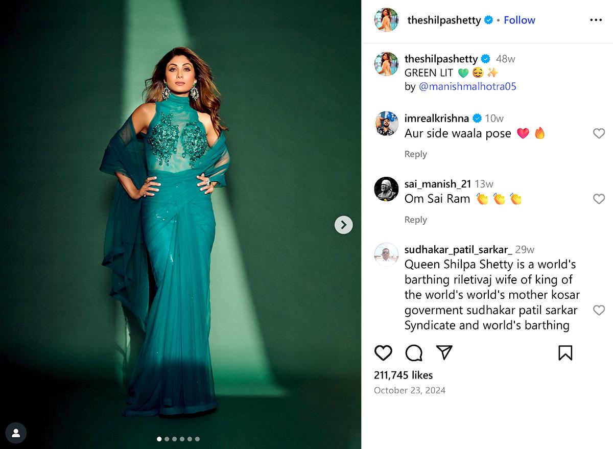 IMAGE: Shilpa Shetty gives the sari a modern twist in an Indo-western halter gown that blends classic drape with red carpet drama. Photograph: Kind courtesy Shilpa Shetty/Instagram