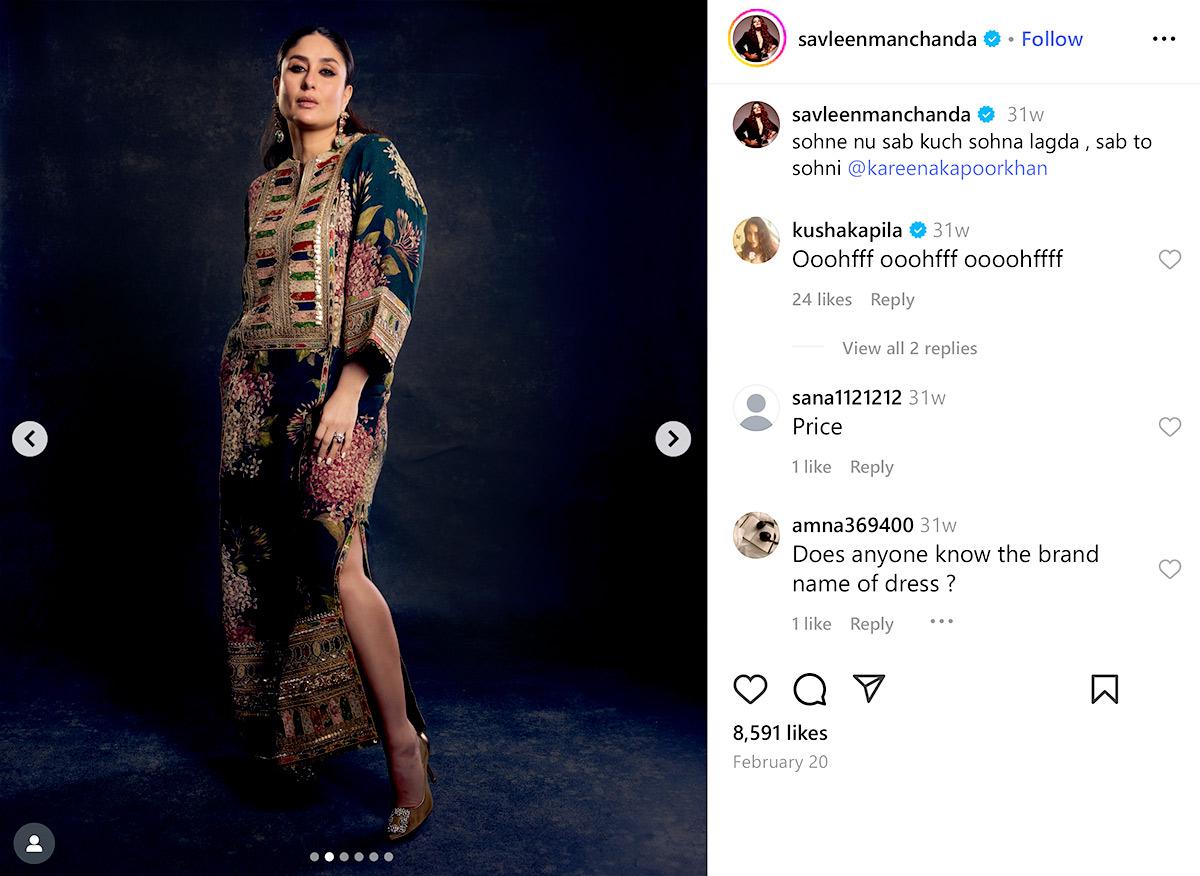 IMAGE: Kareena Kapoor Khan keeps it bold and breezy in a printed kurta with a slit, ditching the bottoms for a modish look. Photograph: Kind courtesy Savleen Manchanda/Instagram