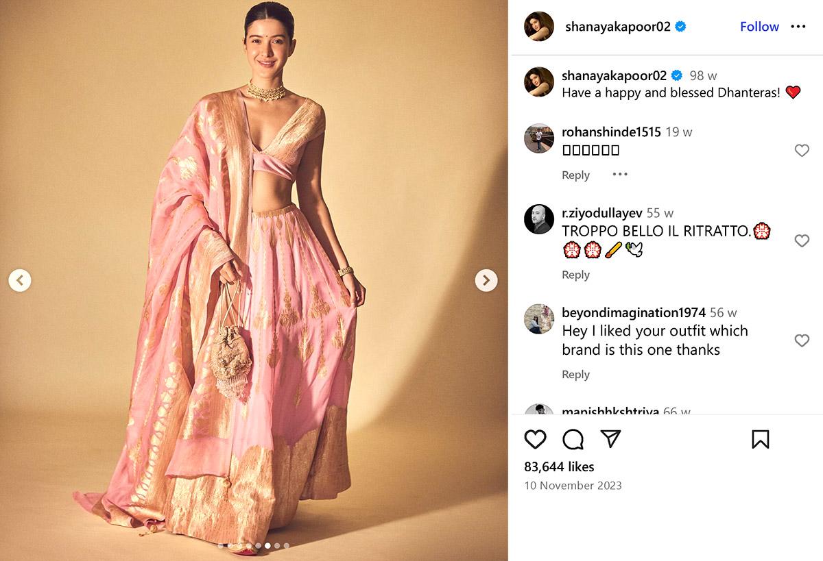 IMAGE: Shanaya Kapoor glows in a baby pink silk lehenga with champagne-gold accents, styling it with a matching potli bag that adds just the right touch of elegance. Photograph: Kind courtesy Shanaya Kapoor/Instagram