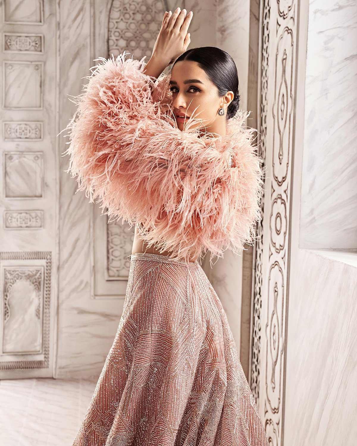 IMAGE Shraddha Kapoor makes a statement in dusty pink, rocking an OTT feathered blouse with a matching skirt detailed with beads for maximum drama. Photograph: Kind courtesy Shraddha Kapoor/Instagram
