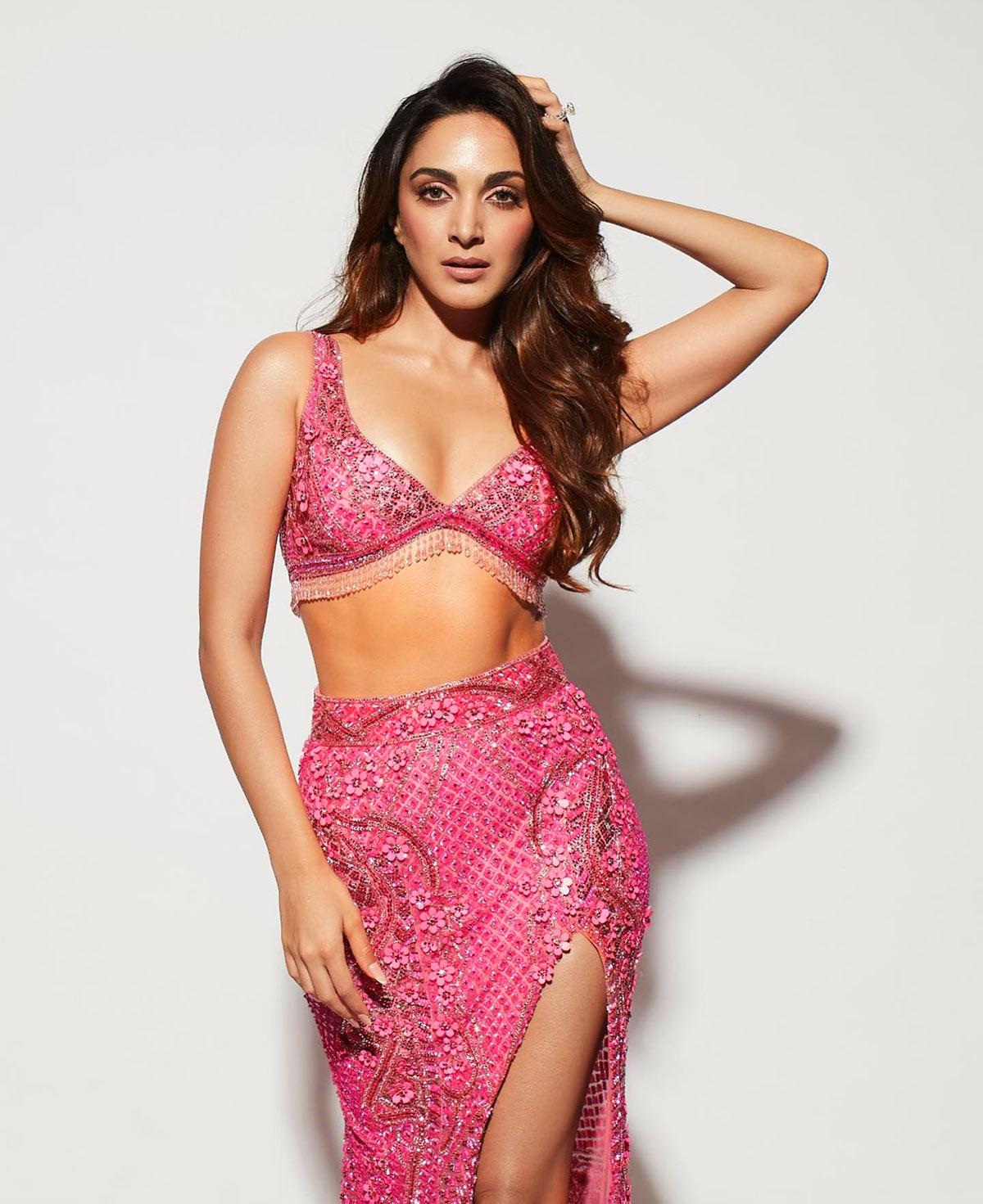 IMAGE: Kiara Advani turns up the heat in a hot pink Indo-western set, flaunting a tasselled V-neck blouse with a matching mermaid skirt and thigh-high slit. Photograph: Kind courtesy Kiara Advani/Instagram