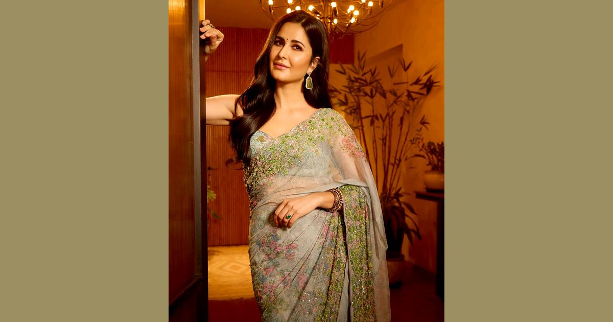 IMAGE: The emerald rind and fancy drop earrings look great with Katrina Kaif's shimmery green sari. Photograph: Kind courtesy Katrina Kaif/Instagram