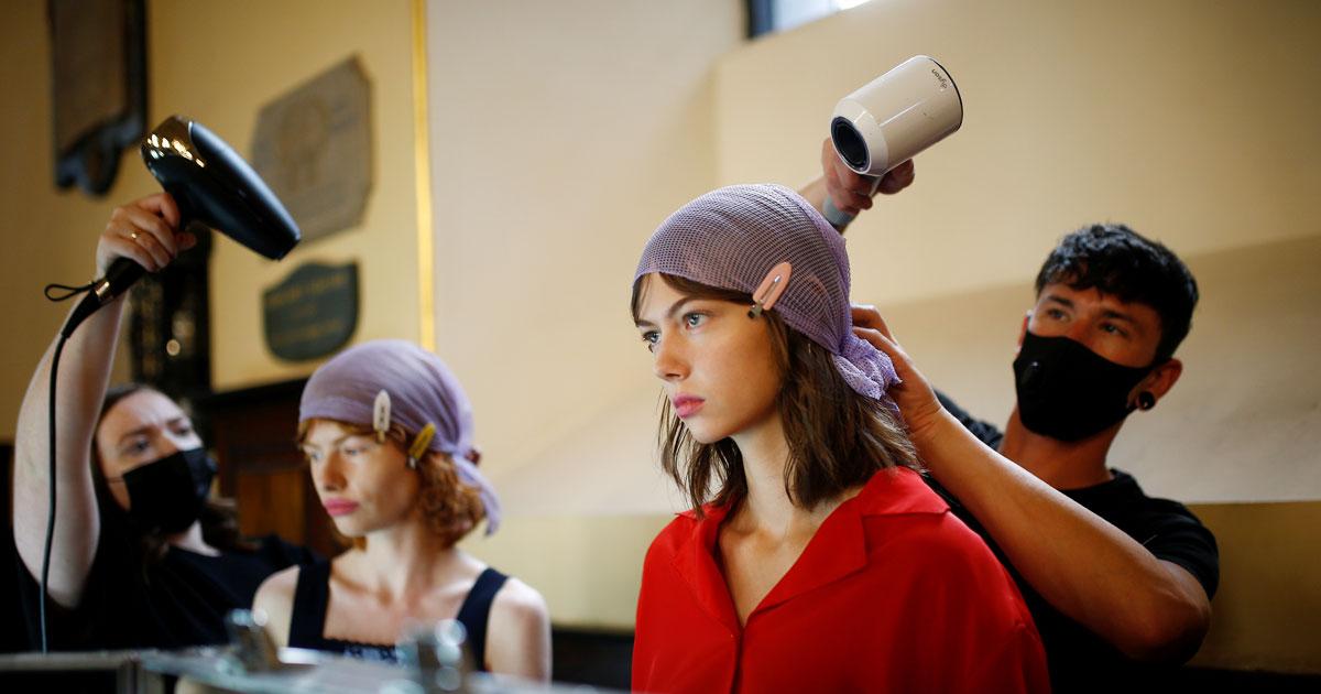 IMAGE: Models prepare backstage for the Bora Aksu catwalk show at the London Fashion Week 2020, September 18, 2020. All photographs: Henry Nicholls/Reuters