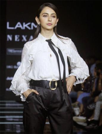 IMAGE: Go for the classic white shirt and black trouser combination like Rakul Preet Singh.