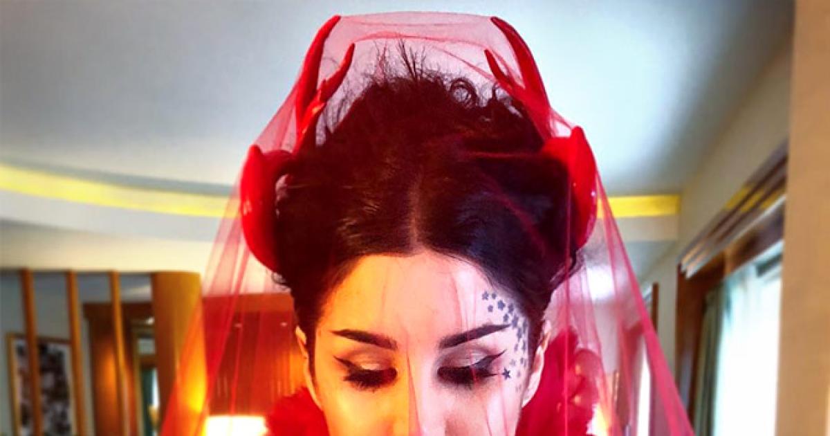 Kat Von D ditched white and opted for a blood red veiled gown custom gown by Majesty Black and the high-end, edgy Adolfo Sanchez to match with the theme: en vida y en muerte -- which translates to 'in life and in death.'