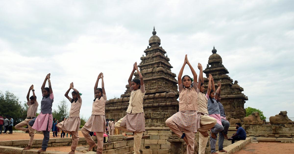 IMAGE: Students perform Vrikshasana (tree pose) at the Mahabalipuram temple, which is a UNESCO World Heritage site.