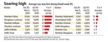 Average economy airfares on major routes across the country for Diwali week have risen by as much as 52 per cent from last year, driven by a weaker rupee and shrinking network capacity amid aircraft shortages.