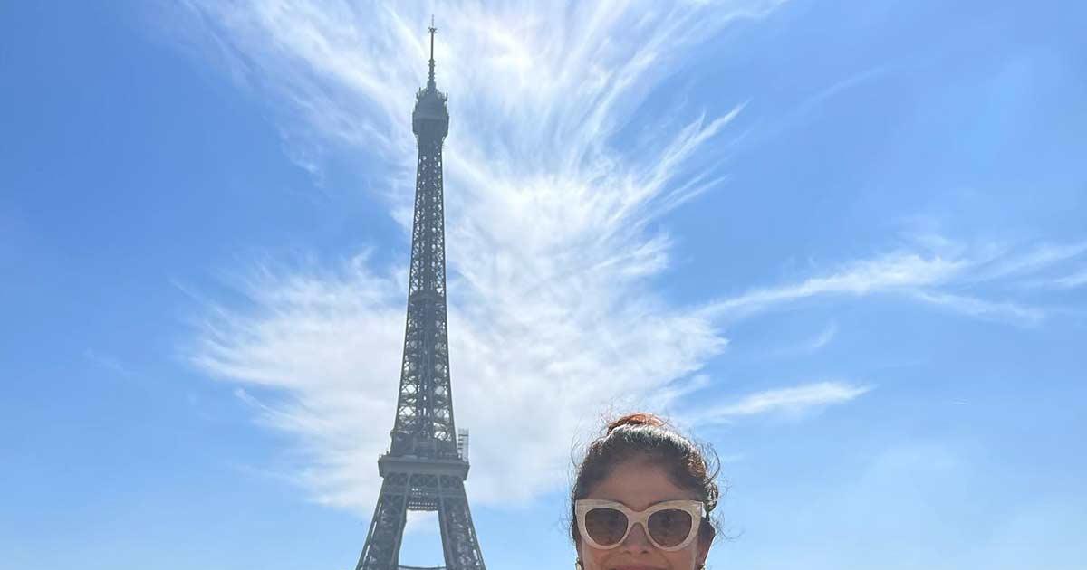 IMAGE: Pooja makes her vacation in Europe more fun by doing yoga in front of the Eiffel Tower.