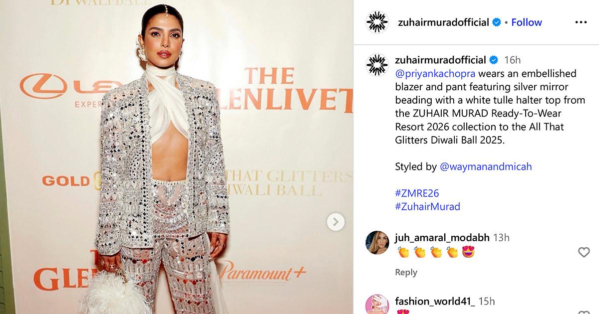 IMAGE: Priyanka Chopra, one of the star guests of the event, shimmered in a silver mirror-beaded blazer and pants, teamed with a white tulle halter top, from Zuhair Murad's Resort 2026 collection. Photograph: Kind courtesy Zuhair/Instagram