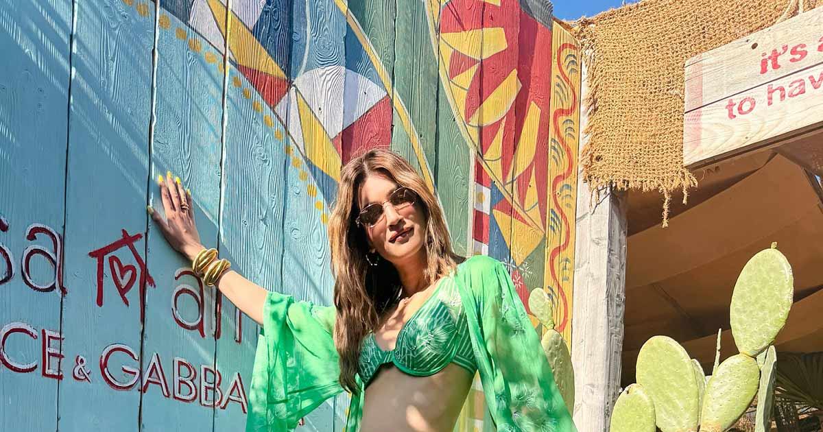 IMAGE: Kriti Sanon turns island goddess in a green three-piece set featuring a bralette, slit skirt and floor-length sheer cape with bell sleeves. Perfect for beach resorts, island dinners or Bali-core vacations where every corner is a photo-op. Photograph: Kind courtesy Kriti Sanon/Instagram
