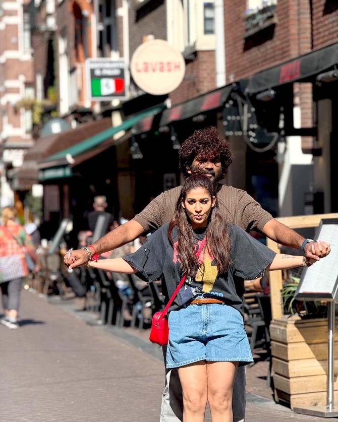 IMAGE: Lazy girls? We got you covered. Nayanthara’s oversized tee, denim shorts, tan belt and pop-red sling is the perfect uniform for chill city strolls, relaxed shopping days or low-key exploring. Photograph: Kind courtesy Nayanthara/Instagram