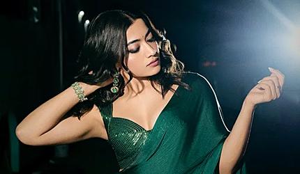 IMAGE: Rashmika could teach a masterclass on how to make saris look modern. She drapes an emerald green satin silk sari with a sequinned bralette blouse.