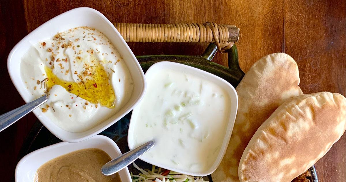 Pour Tahini, Tzatziki and Labneh into small bowls and place them on the tray as well.