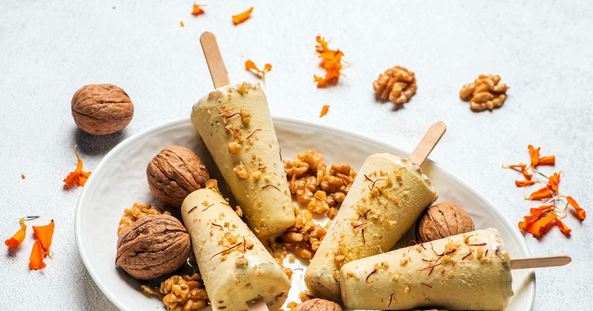 Pour the mixture into kulfi moulds along with some chopped walnuts.