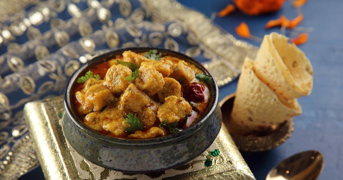 Maharaj Ganga Singh's recipe utilises spices, onions, garlic, green chillies and green coriander to create the flavourful youghurt-based Gatte Ki Sabzi.