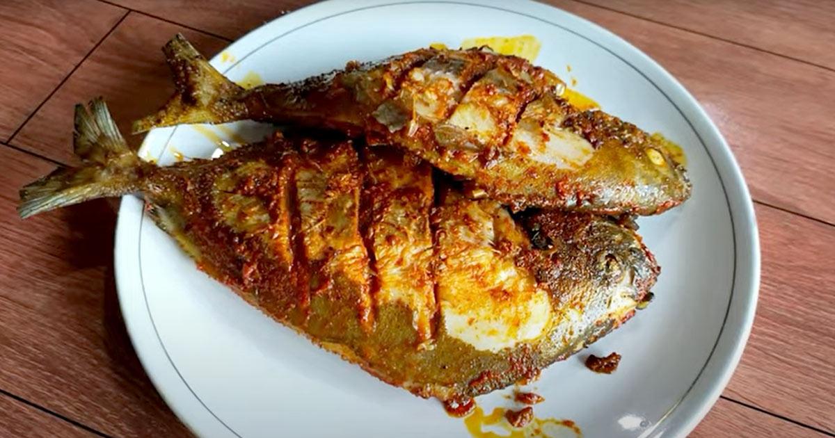 Take off heat and keep aside. - In a flat-bottomed frying pan, big enough to hold the fish, heat 3 tbsp oil and fry one of the marinated fish.
