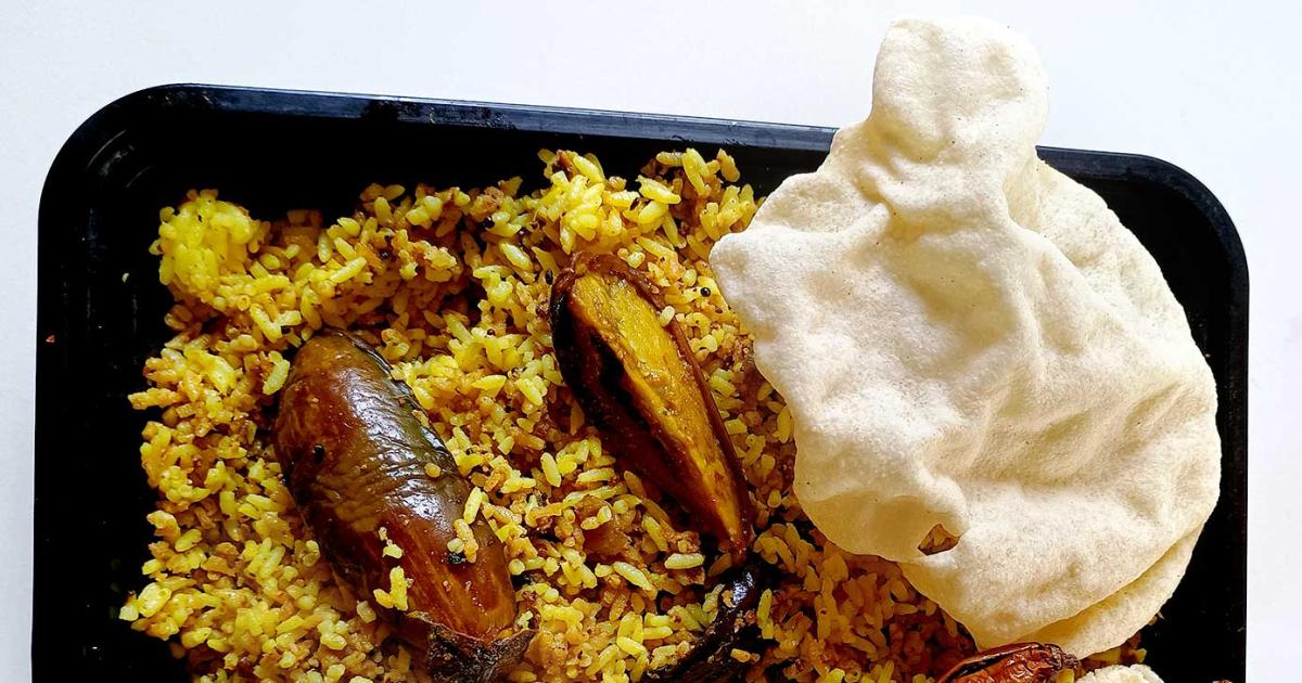 Then add in the roasted eggplant and lightly toss so the eggplant is mixed uniformly through the rice. - Garnish with green dhania and serve with yoghurt and appalams.