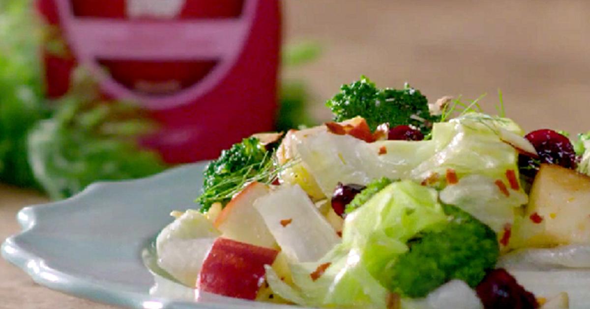 Soak for a minute or so in ice water, drain and pat dry with a kitchen towel. - In another bowl, lightly toss together the broccoli, almonds, apples, lettuce, sea salt, cranberries/raisins, dill.