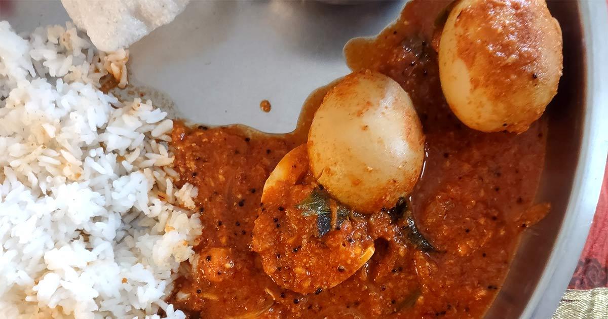 Add in the eggs and bring to a boil again and simmer 4-5 minutes. - Serve hot with steamed rice and ghee or parathas or dosas.