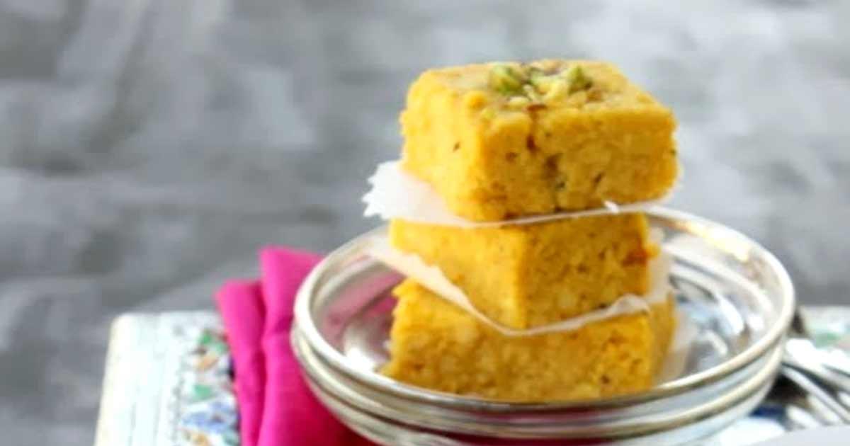 Taruna Bakshi makes use of roasted pumpkin puree to prepare irresistible Pumpkin Petha Kalakand flavoured with cardamom powder and garnished with chopped pistachios.