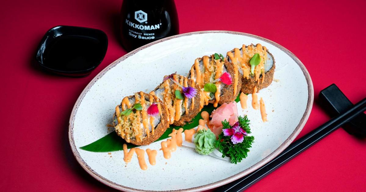 - Garnish the top of the rolls with the spicy mayo, wasabi mayo, edible flowers, spring onion and serve sprinkled with panko crumbs along with pickled ginger, wasabi on the side.