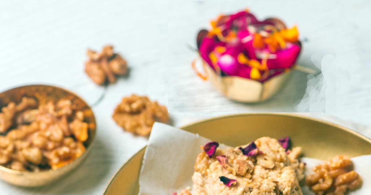 Sprinkle the walnuts and dried rose petals for garnish on top.
