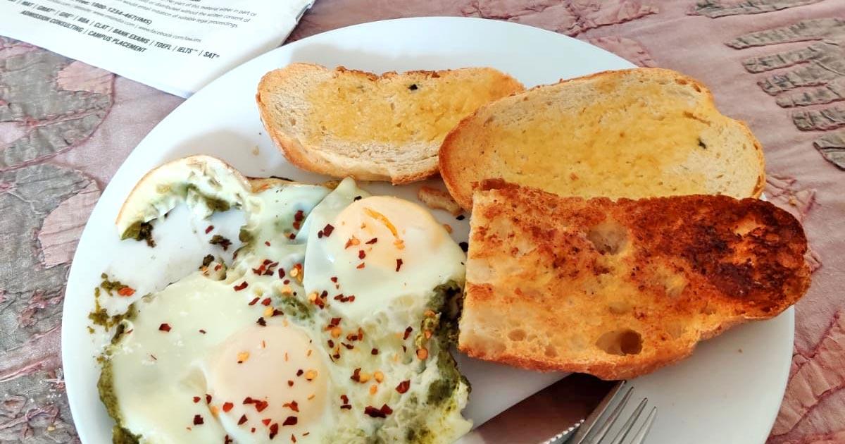 If you have already prepared homemade pesto, or the less delicious, store-bought bottled pesto in the fridge, Spicy Pesto Eggs on Toast, by Kshamaya Daniel, is a quickly-put-together but sumptuous breakfast or brunch.