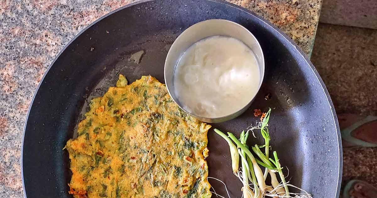 For Jain pudlas, use only the green of the spring onions and omit the bulbs. Also omit the garlic and ginger and replace with a tsp saunth or ginger powder (which is part of the Jain diet).