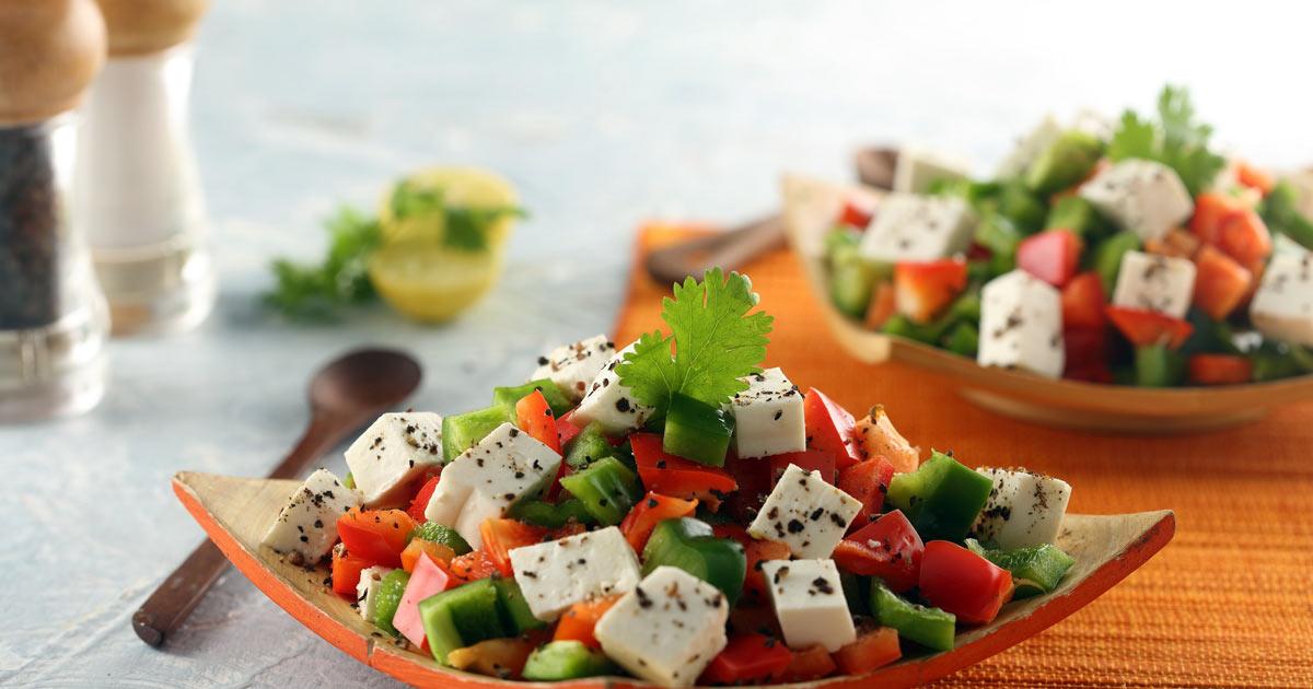 - In a bowl combine the diced red bell pepper, green bell pepper, paneer, chopped red onions and mix.