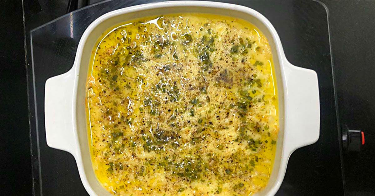 Top with ¼ cup more grated cheese, dash (2-4 tsp) truffle oil, and dried chives. - Bake at 220°C till cheese melts and becomes a little crusty.