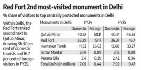 Within Delhi, the Red Fort ranked second next to the Qutub Minar, drawing 36.37 per cent of domestic tourists and 16.7 per cent of foreign visitors in FY25.