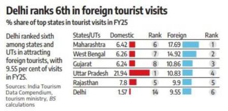 Delhi ranked sixth among states and UTs in attracting foreign tourists, with 9.55 per cent of visits in FY25.