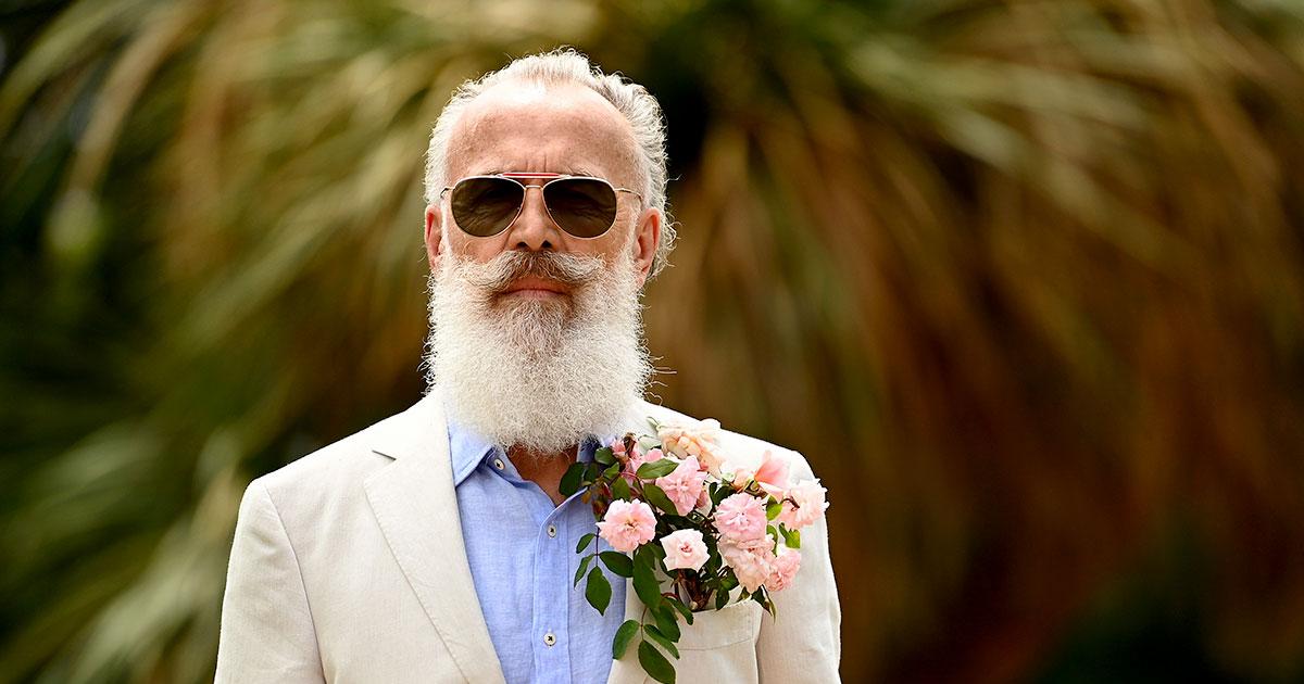 IMAGE: Looking dapper in an off-white lien suit, with flowers tucked into his pocket, this gent.