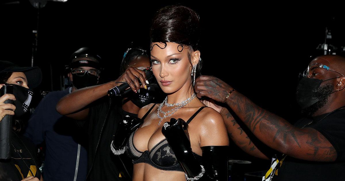 Here is Bella Hadid again, sporting a sexy black lingerie, latex stockings and gloves, a diamond belly chain along with a beehive mullet. Photograph: Jerritt Clark/Getty Images