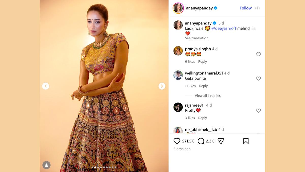 IMAGE: A lehenga perfect for a haldi carnival or a mehendi night; Ananya took maximalism route as a bridesmaid and, boy, did it work. Photograph: Kind courtesy Ananya Panday/Instagram
