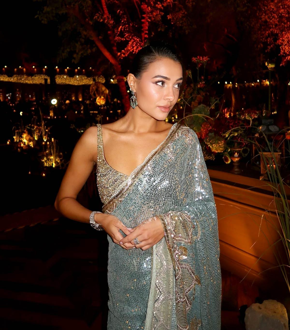 IMAGE: Sequinned saris never go out of style! Tania’s ice-blue one is perfect for cocktail nights or reception evenings. Photograph: Kind courtesy Tania Shroff/Instagram