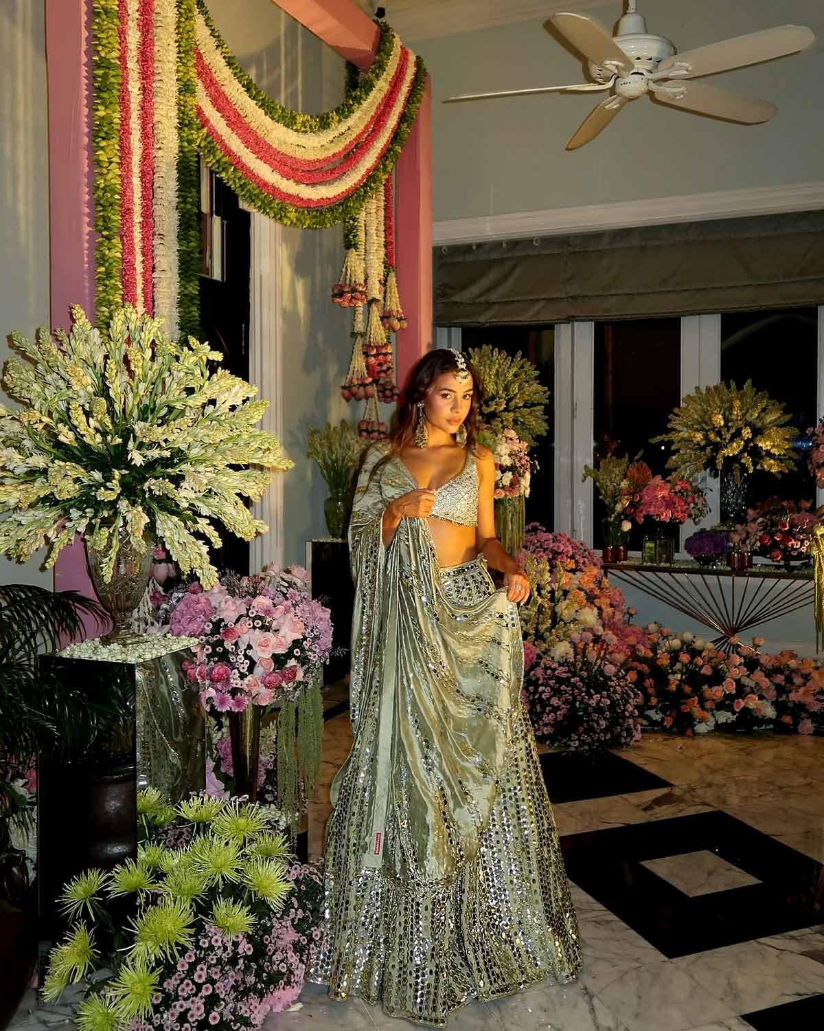 IMAGE: Tania shimmered in a mint green tissue lehenga decked with mirror work, a dreamy pastel look for a sundowner function. Photograph: Kind courtesy Tania Shroff/Instagram