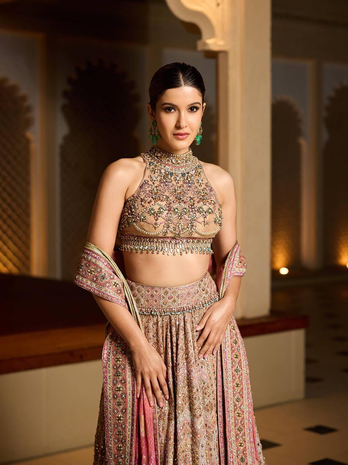 IMAGE: Shanaya Kapoor proves colour contrast can be your best accessory. A pink lehenga, a halter blouse and pop-green earrings is all you need to look festive. Photograph: Kind courtesy Shanaya Kapoor/Instagram