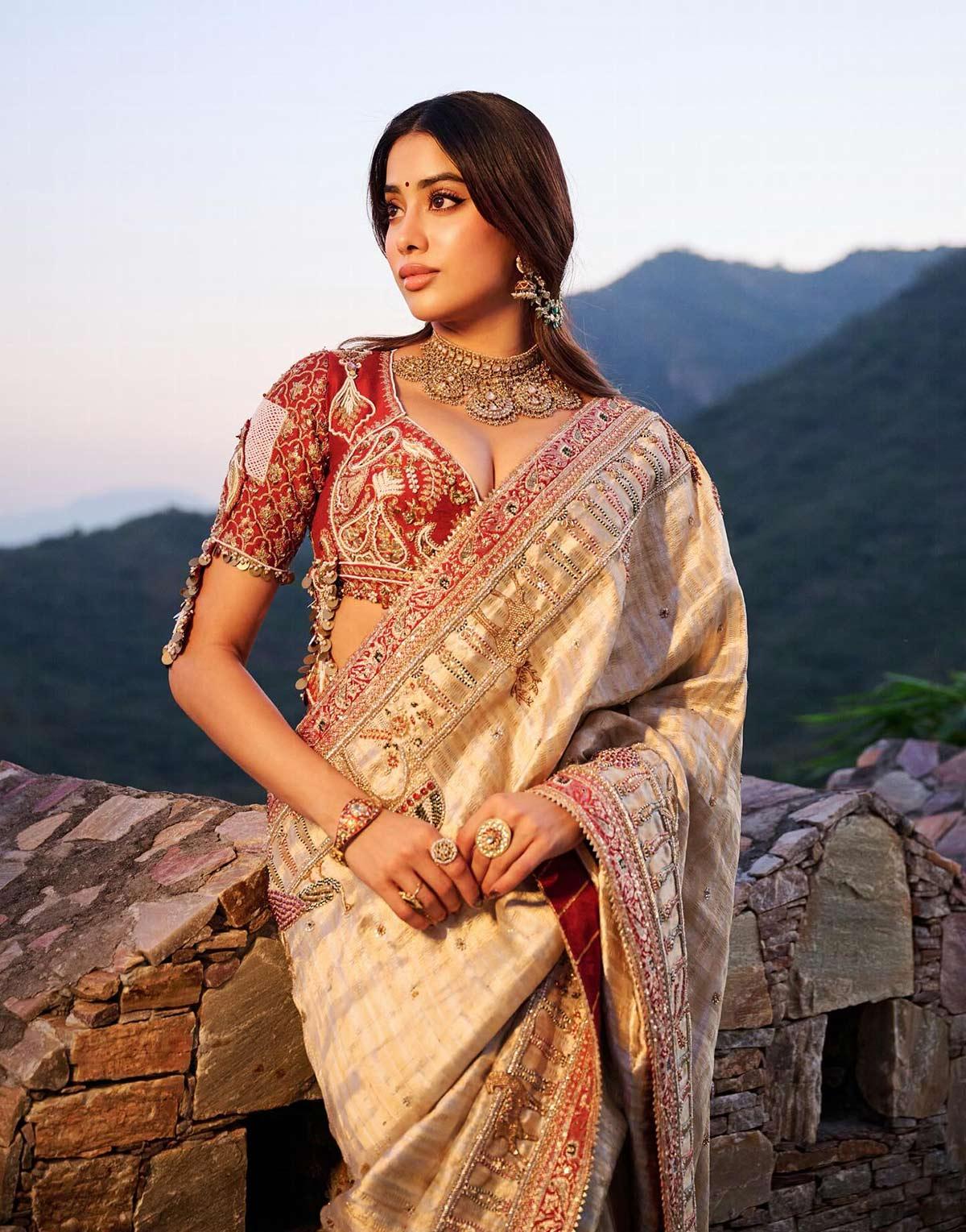 IMAGE: Time to raid your mom’s wardrobe and style those classic silk saris! Janhvi wore a beige drape with a heavily embellished red blouse. The choker and ear chain added just the right amount of drama. Photograph: Kind courtesy Janhvi Kapoor/Instagram