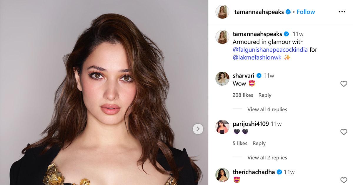 IMAGE: Tamannaah Bhatia dazzles in a bejewelled corset top layered over a sleek black base. Photograph: Kind courtesy Tamannaah Bhatia/Instagram