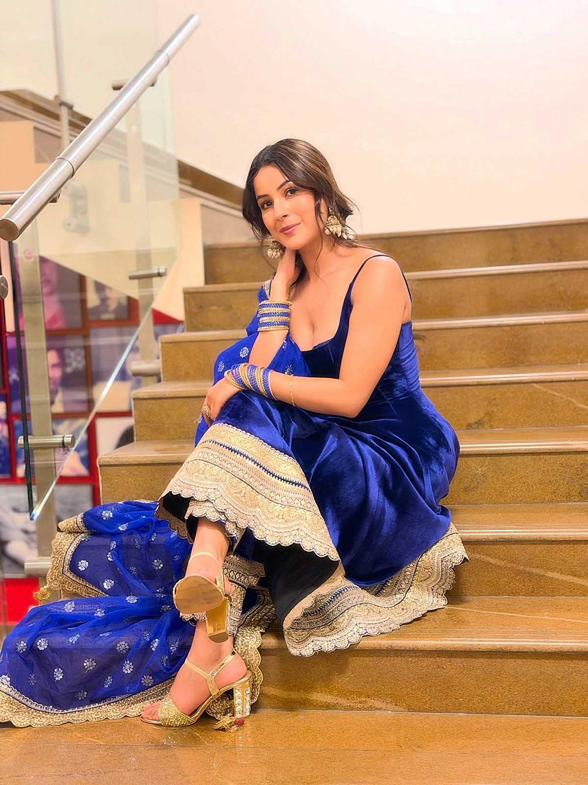IMAGE: She looks like royalty in a midnight-blue velvet anarkali paired with a sheer net dupatta. The blue-and-gold chudiyas and statement ear chains seal the look. All photographs: Kind courtesy Shehnaaz Gill/Instagram