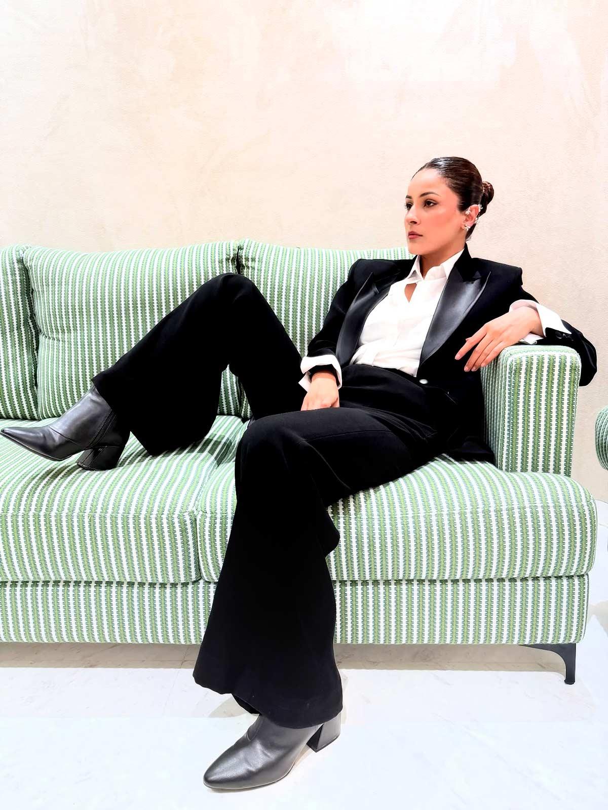 IMAGE: She flips the script in a power-packed black suit straight out of menswear! Styled with heeled boots and a sleek bun, she’s giving full boss energy.