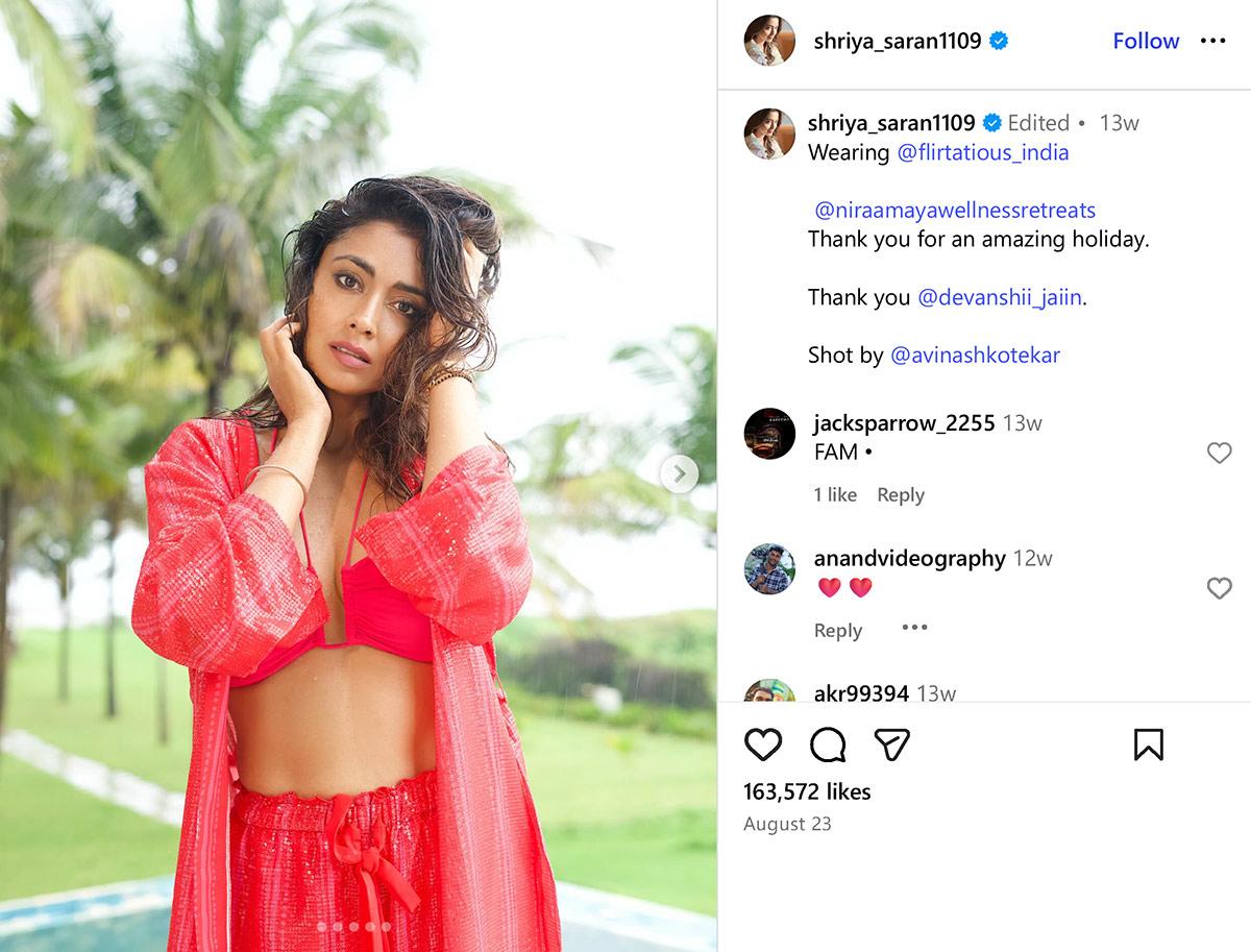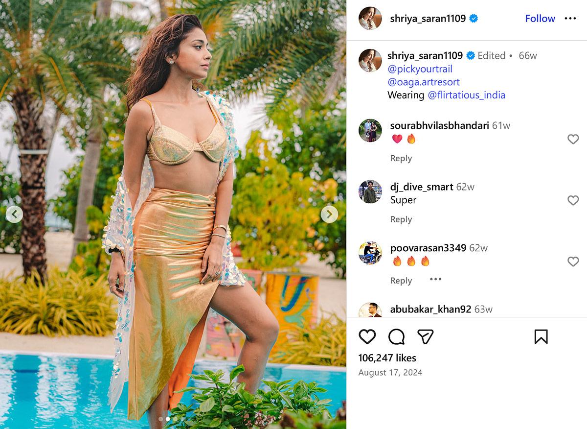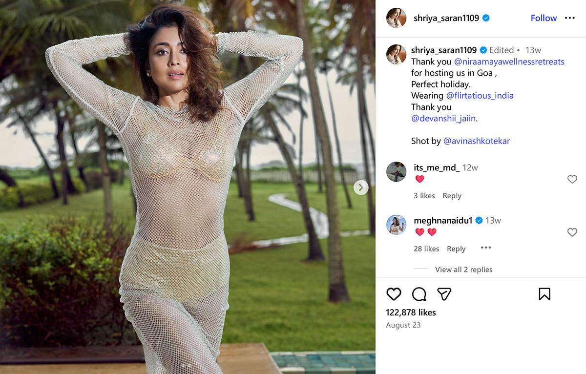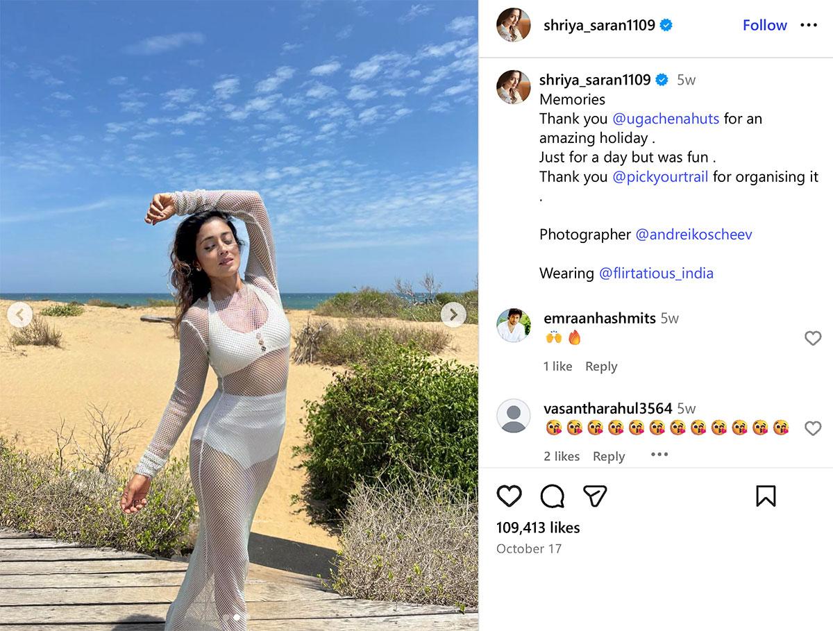 IMAGE: Sheer dresses are officially a beach must-have this season. Shriya throws one over her white bikini for that effortless vibe made for pool days and sunset swims.