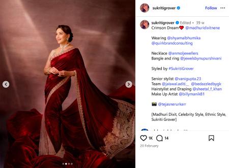 IMAGE: In a red velvet sari styled with a sleeveless silk blouse, Madhuri Dixit brings back timeless winter wedding glamour. Photograph: Kind courtesy Madhuri Dixit/Instagram